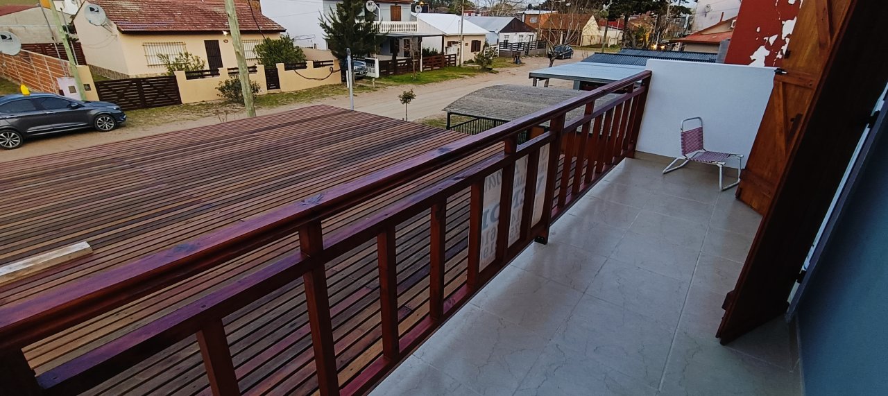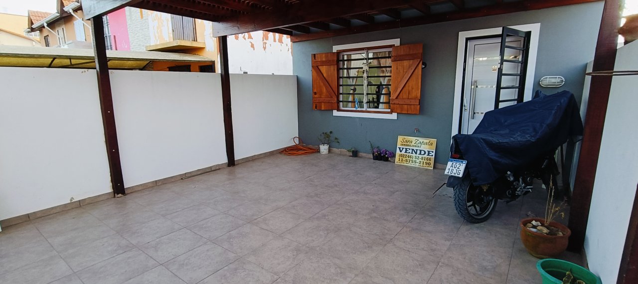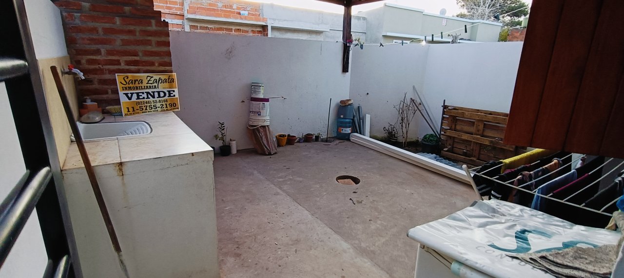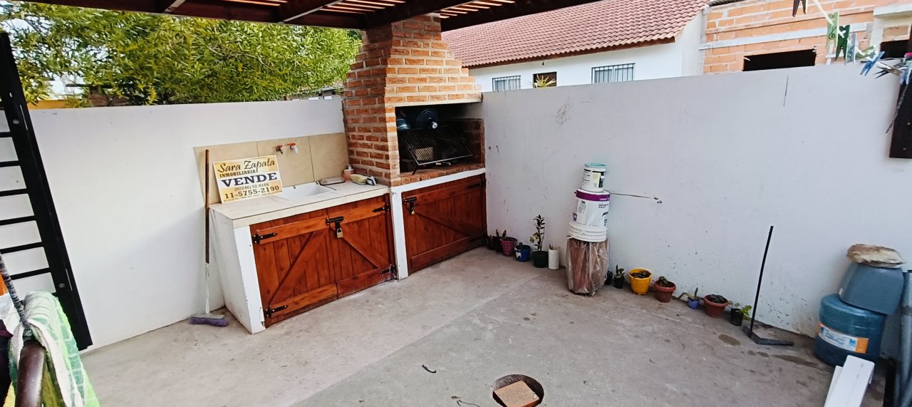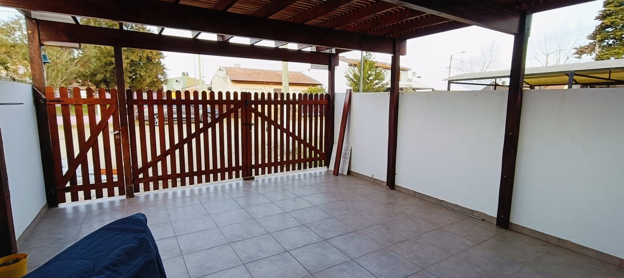 PATIO semi cubierto al frente con espacio para DOS AUTOS, + PATIO individual atrás semi cubierto donde se ubican la parrilla campana, la pileta de lavado, gabinetes para bomba de agua y garrafa, con aberturas de madera.