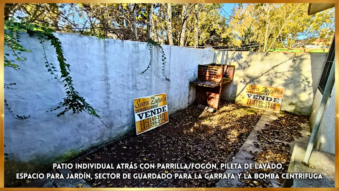- y PATIO individual atrás con parrilla/fogón, pileta de lavado, espacio para jardín, sector de guardado para la garrafa y la bomba centrifuga.