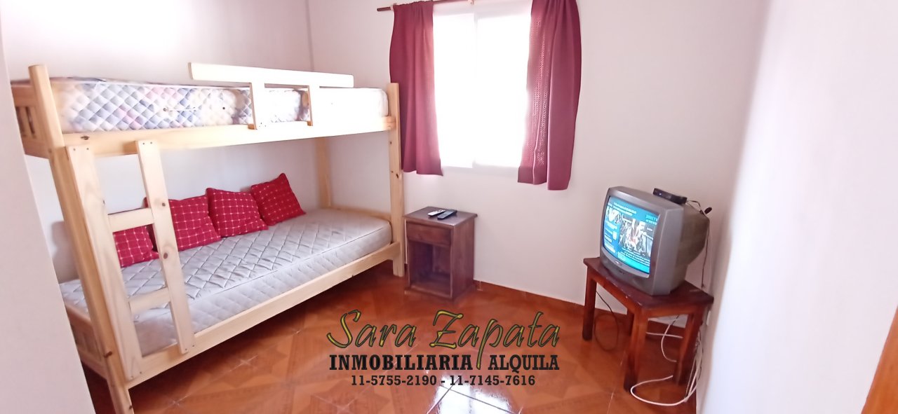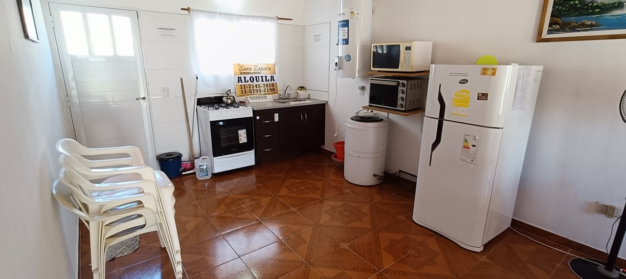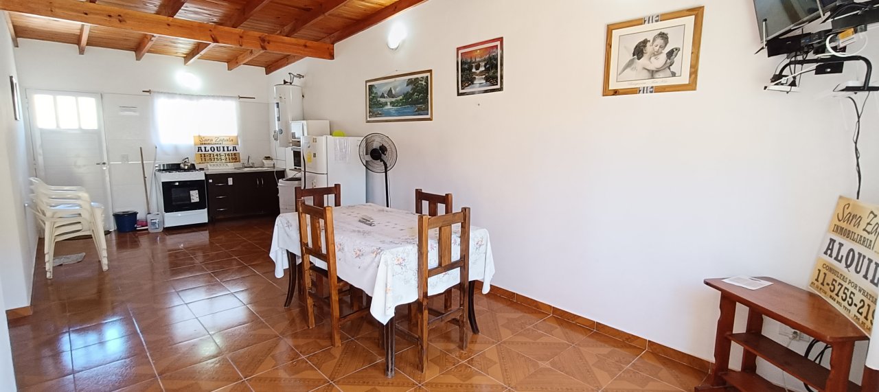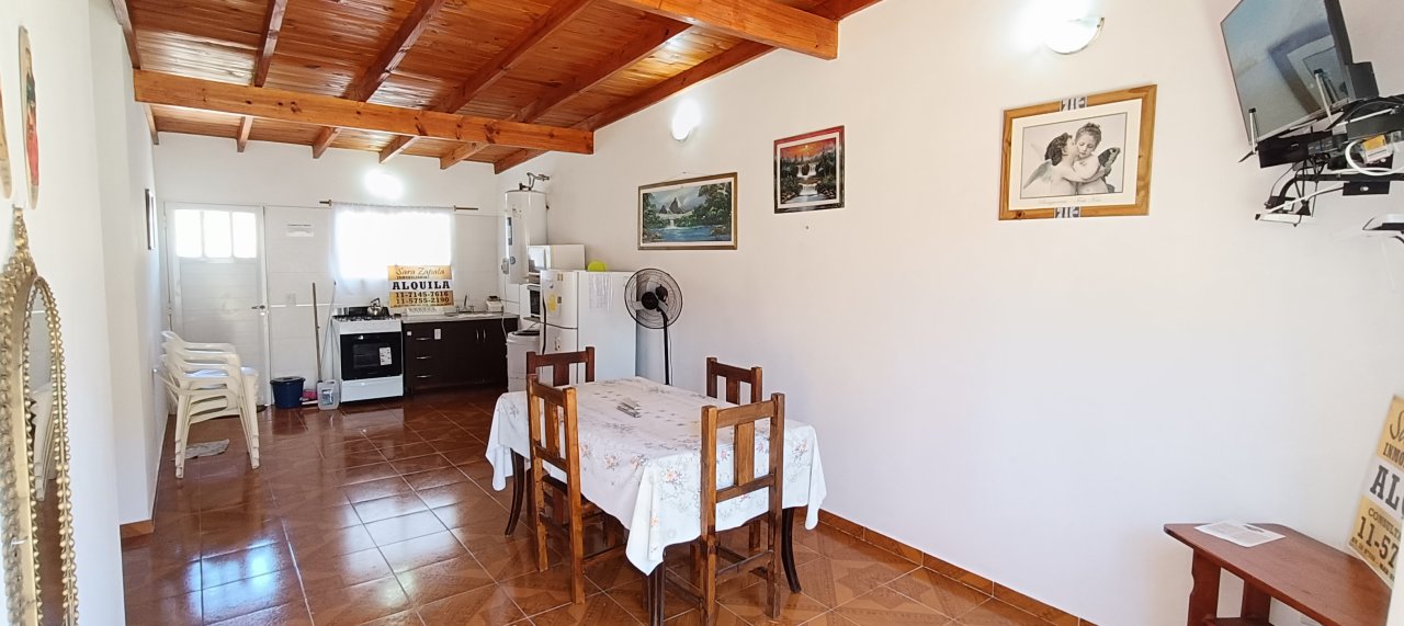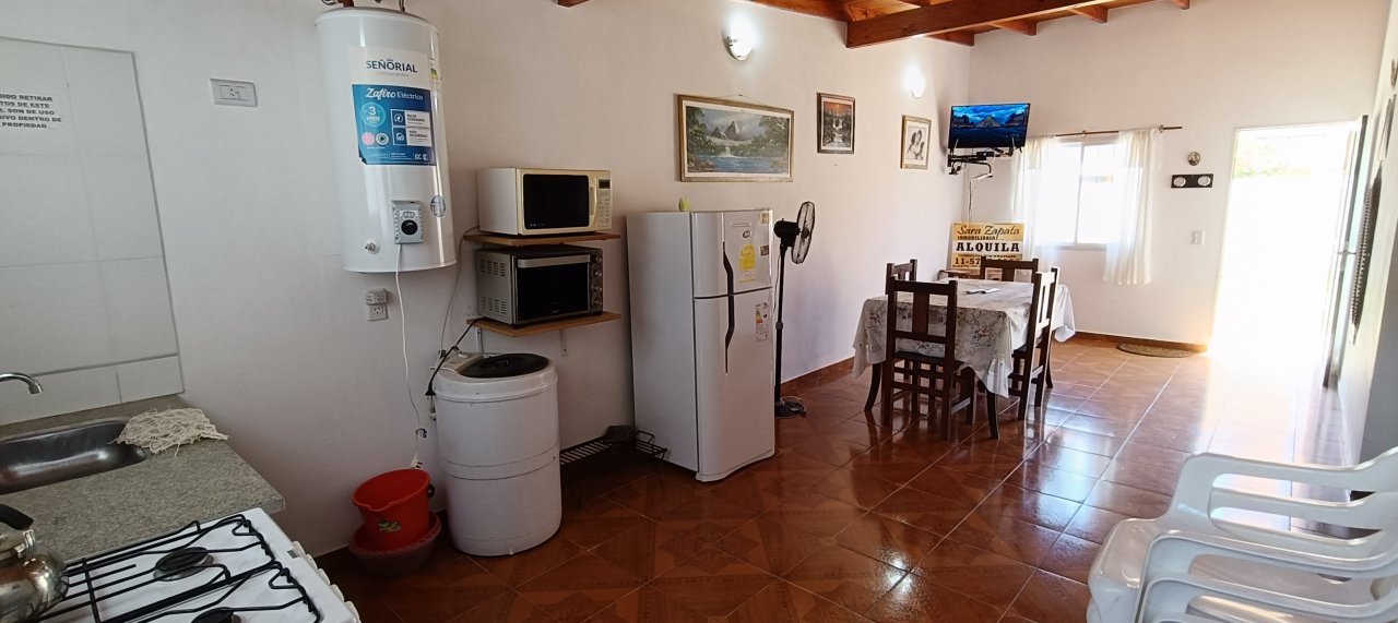 Cuenta con un amplio comedor con tv + Directv prepago, + cocina integrada con vajilla básica + microondas + horno eléctrico, cocina nueva, heladera con freezer y termotanque eléctrico grande, todo nuevo.