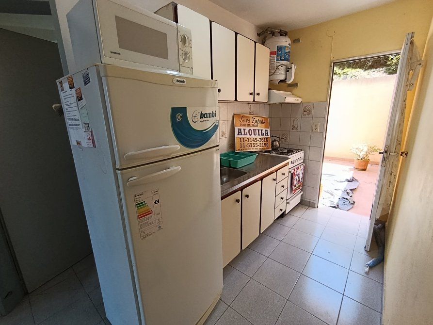 ~ cocina en lateral semi separada con vajilla básica, heladera con freezer, microondas y extractor de aire;