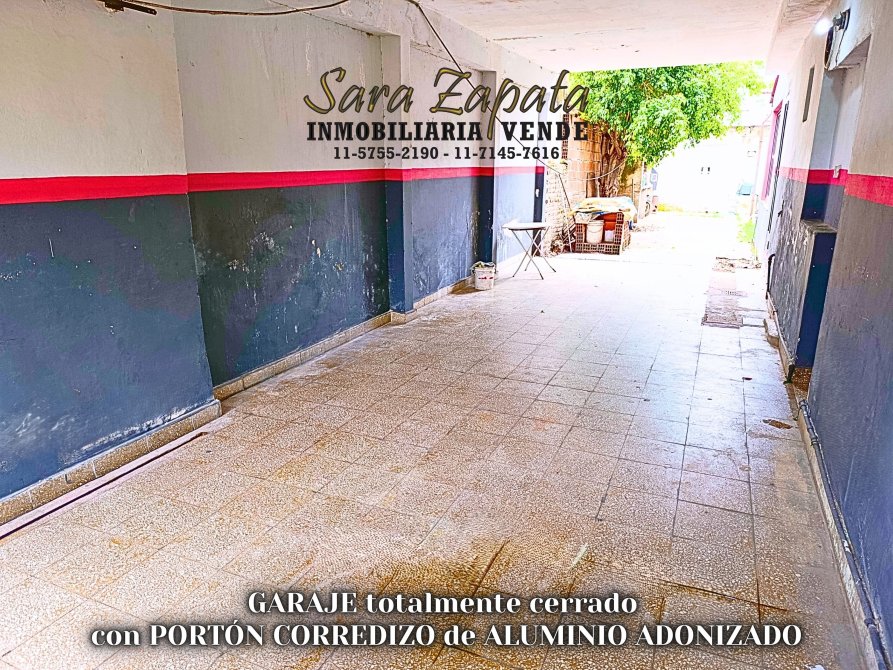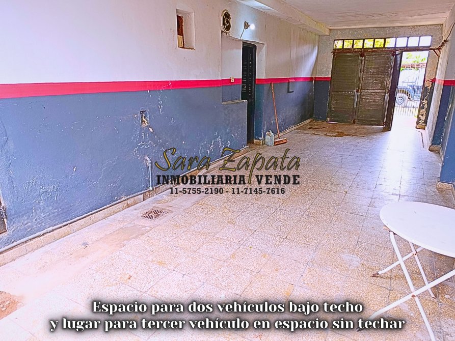 ~ Garaje techado con portón corredizo de aluminio anodizado al frente, con espacio para DOS vehículos chicos bajo techo y espacio para un tercer vehículo en el patio sin techar.